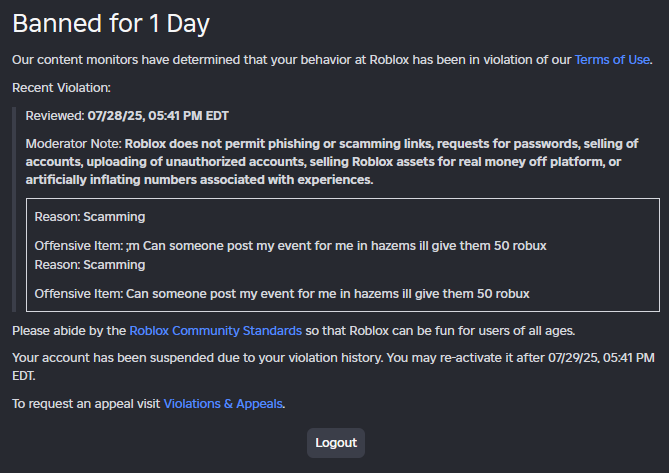 For some context, I am in a discord server where people host sort of like gameshows and the winner gets robux, I know you might think “that’s a scam” But it genuinely isnt. In these gameshows, the winner gets a prize that is given to them through a gamepass and whatnot, as I was starting my event, I asked if someone could help me out with my event and post it in other discord servers (like hazems) and I said I would pay 50 robux (I was being genuine) And I then got banned for saying that. Back to the question at hand, because the ban shows the “scamming” tag and on help.roblox.com it shows this,