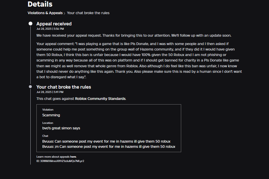 I was once banned for hate speech (i said, “hi guys”) and i got banned for scamming cause i gifted someone a gamepass out of the kindness of my heart